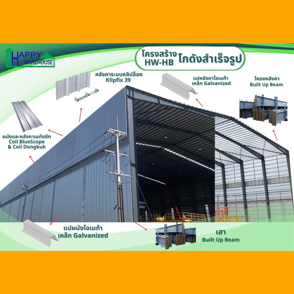 รายละเอียด โกดังสำเร็จรูป HW-HB ขนาด 46x150x18.40 เมตร 6900 ตร.ม. หลังคาเมทัลชีท 0.47 mm. บันไดแบบมีชานพัก 10 ตร.ม. บานเกร็ด 900 ตร.ม. งานฐานรากเข็มตอก งานคอนกรีตพื้น วางบนดิน หมายเหตุ ราคารวมภาษีมูลค่าเพิ่ม 7% ค่าขนส่งคิดตามระยะทาง